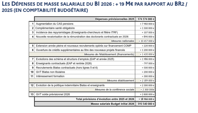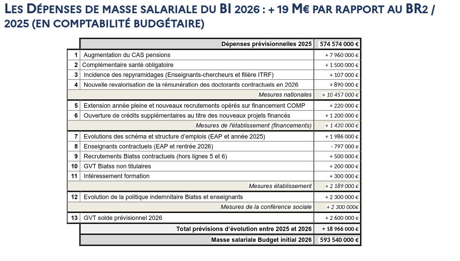 Face à l’incertitude associée au vote du PLF 2026, le BI 2026 se base donc sur des hypothèses, en particulier l’évolution du régime indemnitaire des EC prévue par la LPR (seul 1M€ inclus au BI pour un chiffrage de 2,9M€) ou encore la compensation à hauteur de 50% de l’augmentation du CAS pension (4M€ de recettes prévues, pour un chiffrage de la mesure à 8M€). Au total, les critères de soutenabilité budgétaire sont tous dans le rouge : que ce soit le niveau de trésorerie qui est de 8,3 jours (le seuil requis est de 30 jours), le niveau de fonds de roulement (- 12 jours) ou le ratio de Dizambourg ou charges de personnel/produits encaissables (84,6% pour un seuil prudentiel de 83%). Comme le précise la note de l’ordonnateur, « un fonds de roulement négatif expose l’établissement à un risque accru de tensions de trésorerie, réduit sa marge de manœuvre pour absorber les aléas, et compromet la possibilité de financer des investissements sans recourir à des mesures exceptionnelles ».